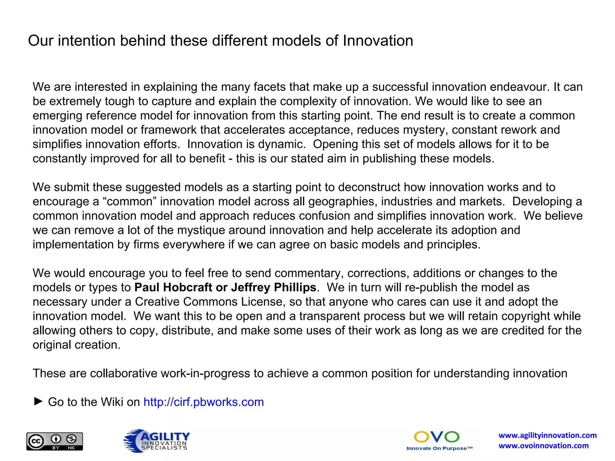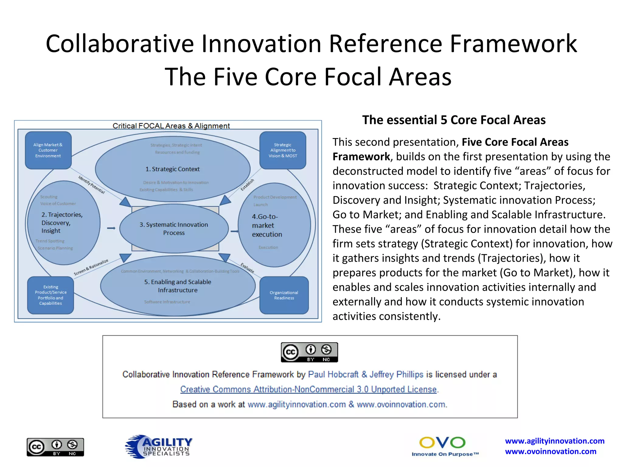 The document outlines a collaborative innovation reference framework focusing on five core areas essential for innovation success: strategic context, trajectories, systematic innovation process, go-to-market execution, and enabling infrastructure. It emphasizes the importance of aligning organizational strategies with customer insights, managing the innovation process systematically, and sustaining innovation efforts over time. The goal is to establish a common innovation model that simplifies understanding and fosters collaboration across various industries and markets.
