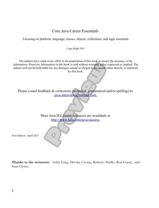 The document is a comprehensive guide on core Java essentials, designed to assist individuals in preparing for careers in Java programming, focusing on technical concepts, language fundamentals, object-oriented principles, and problem-solving skills. It emphasizes the importance of preparation for job interviews and offers guidance on common interview questions and best practices in software development. The authors aim to enhance readers' knowledge, confidence, and ability to communicate effectively in both interviews and professional settings.