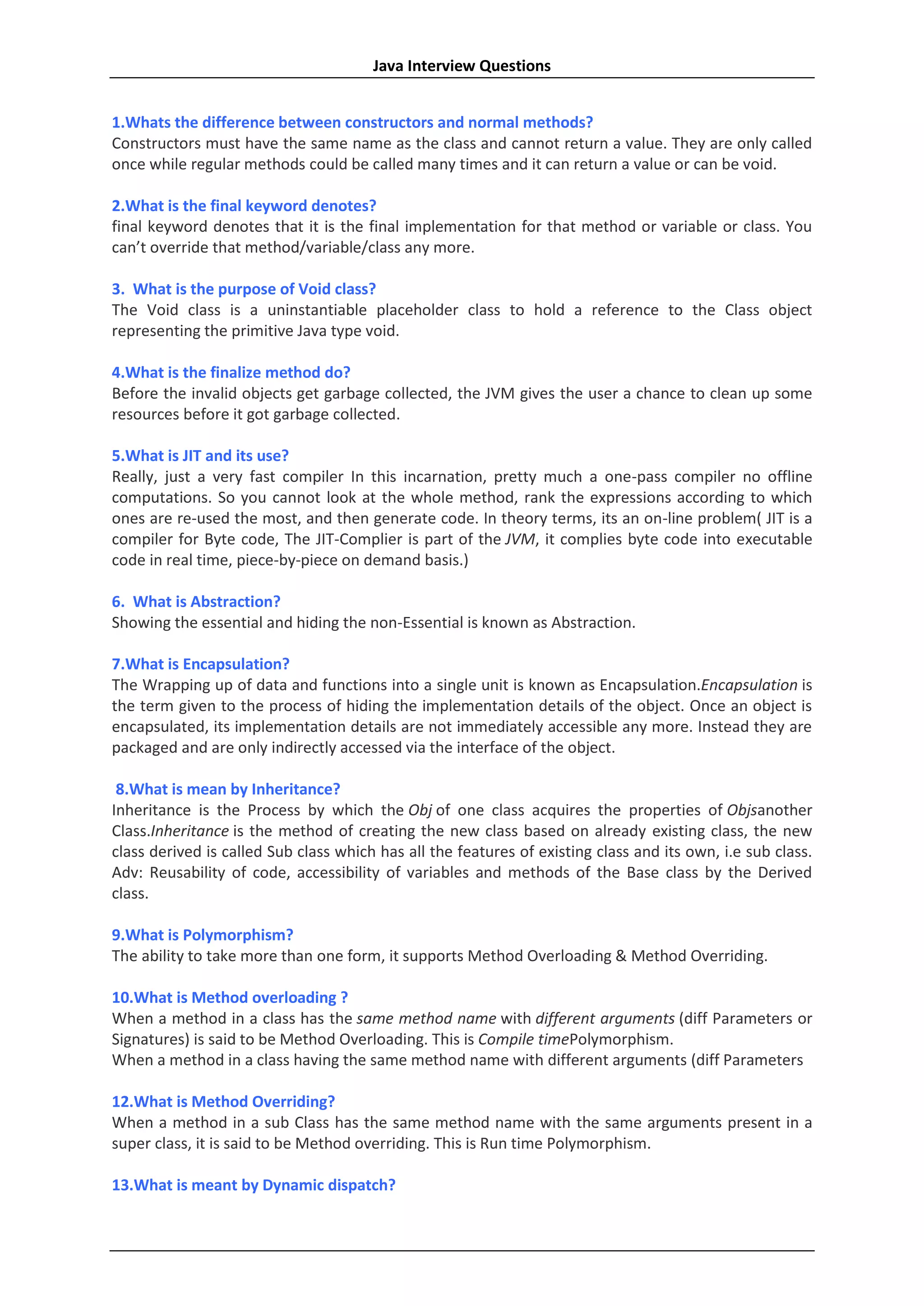 - Details about finalize methods, just-in-time compilation, abstraction, encapsulation, inheritance, polymorphism, and method overloading and overriding.