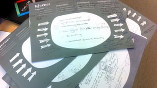 The document describes The Core Model, a workshop method for structuring digital products and content around user needs and business goals. The workshop is facilitated in 5 steps: 1) Identifying core pages by matching goals and tasks, 2) Defining inward paths to content, 3) Determining core content, 4) Establishing forward paths after tasks are complete, 5) Prioritizing elements for mobile. Examples demonstrate increasing donations, membership and project leads by applying the model. The method emphasizes objectives, core elements, and creative forward paths over traditional site hierarchies.