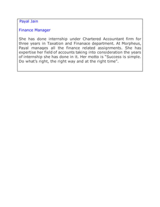 The document profiles several employees of Morpheus and provides details about their education, experience, roles and responsibilities, and mottos. It summarizes the backgrounds and roles of Shardul Naik (responsible for recruitments and employee engagement), Sonal Shetty (completes tasks on time and received performance awards), and Nipa Bhayani (handles business partners and franchise support) at Morpheus.
