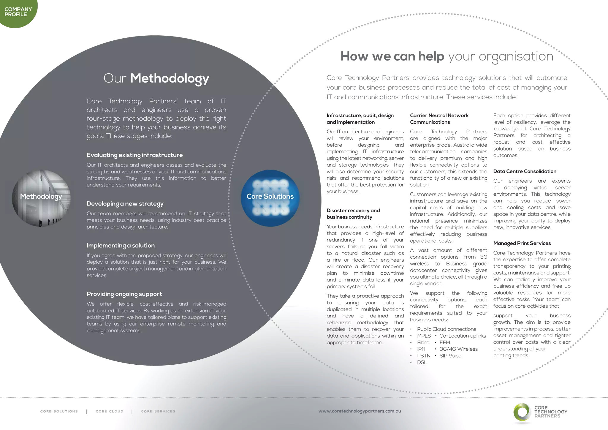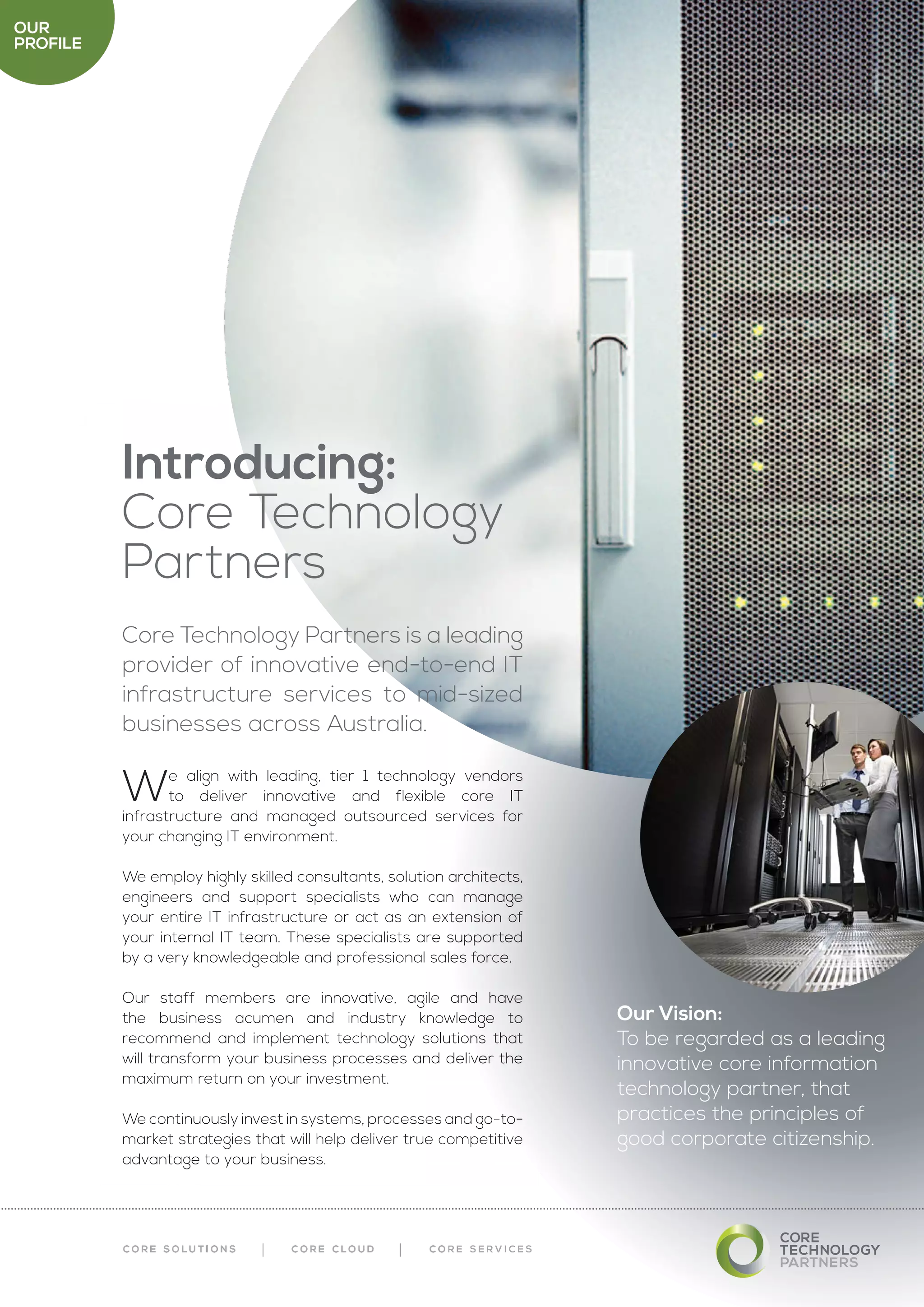 Core Technology Partners is a leading provider of innovative IT infrastructure services and solutions to mid-sized Australian businesses. They employ skilled consultants and specialists to manage a client's entire IT infrastructure or act as an extension of their internal IT team. Core Technology Partners continuously invests in systems and strategies to deliver competitive advantages to clients through solutions like infrastructure design, disaster recovery, data center consolidation, managed print services, and cloud computing services.