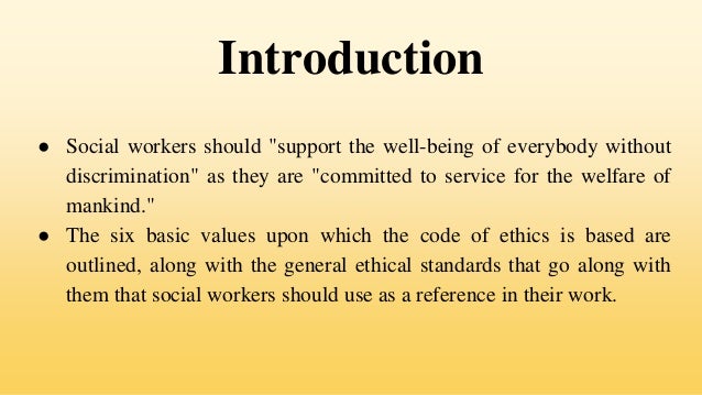 Social workers should "support the well-being of everybody without discrimination" as they are "committed to service for the welfare of mankind."The six basic values upon which the code of ethics is based are outlined, along with the general ethical standards that go along with them that social workers should use as a reference in their work.