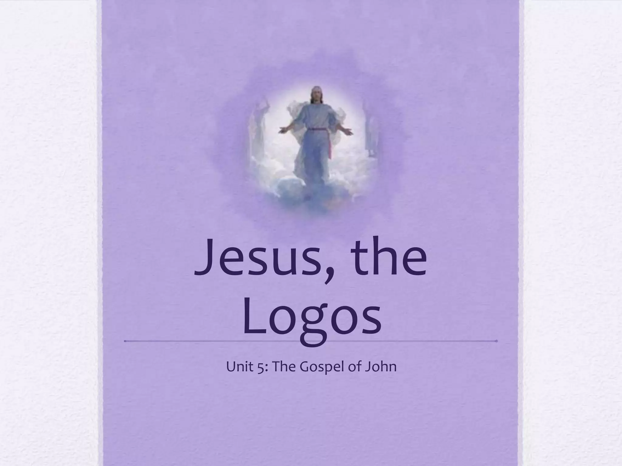 This document provides an overview of key aspects of the Gospel of John. It was written around 95 AD for a Jewish-Christian audience who had been expelled from their synagogues. The gospel portrays Jesus as the Logos, or Word of God. The prologue traces Jesus' origins back to God. It describes Jesus as the light of the world who enlightens all people, though he was not accepted by his own. Those who believe in him become children of God. The Word became flesh through Jesus Christ.