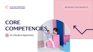 This document discusses the core competencies that apprentices should focus on developing in their training programs. It identifies five key competencies: 1) technical skills in their chosen trade, 2) problem-solving and critical thinking abilities, 3) communication skills, 4) adaptability and flexibility, and 5) professionalism and a strong work ethic. Developing these competencies is crucial for apprentices to succeed in their programs and careers.