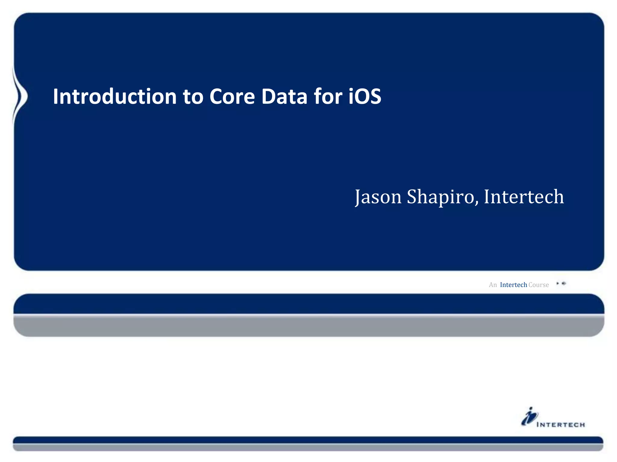 The document provides an introduction to Core Data for iOS. It discusses options for data persistence in iOS like the file system, networked data stores, SQLite, and Core Data. It describes Core Data as an object-oriented API for managing object graphs and models that typically uses SQLite for storage. It outlines the main classes in the Core Data architecture: Managed Objects, Managed Object Context, Managed Object Model, Persistent Store Coordinator, and Persistent Store.