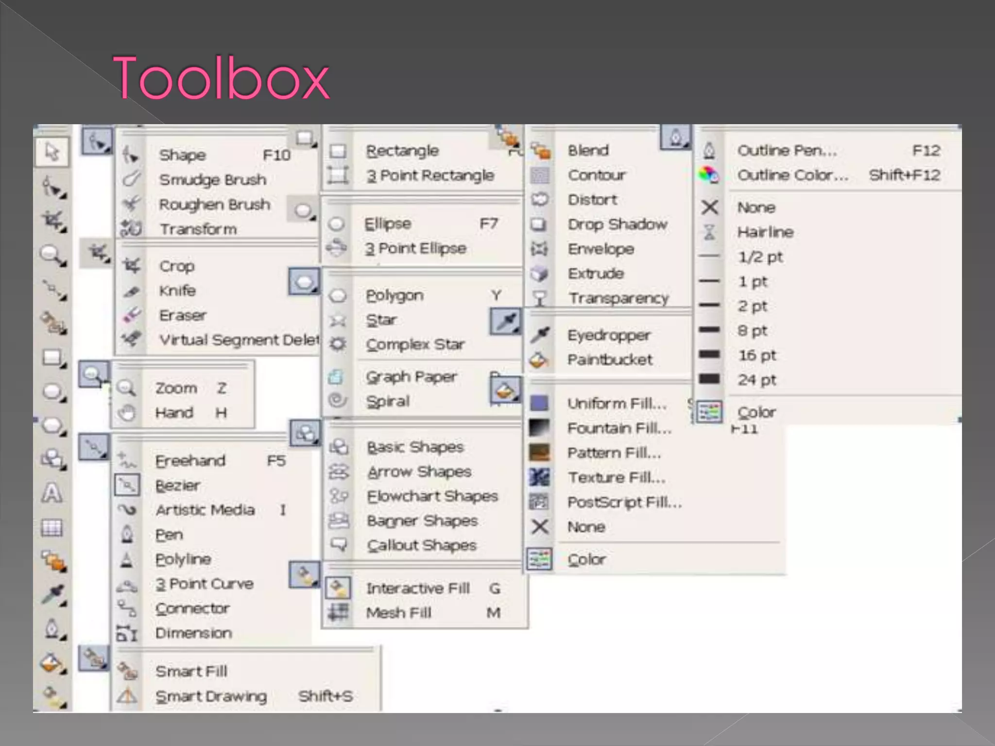 Dokumen ini merinci berbagai fungsi dan alat dalam Corel Draw X6, termasuk ikon dan tool untuk memilih, mengedit, menggambar, dan mewarnai objek. Alat seperti knife, eraser, dan berbagai penggambaran geometris juga dijelaskan untuk meningkatkan manipulasi desain. Selain itu, terdapat informasi mengenai penggunaan warna, efek visual, dan dimensionisasi objek dalam desain grafis.