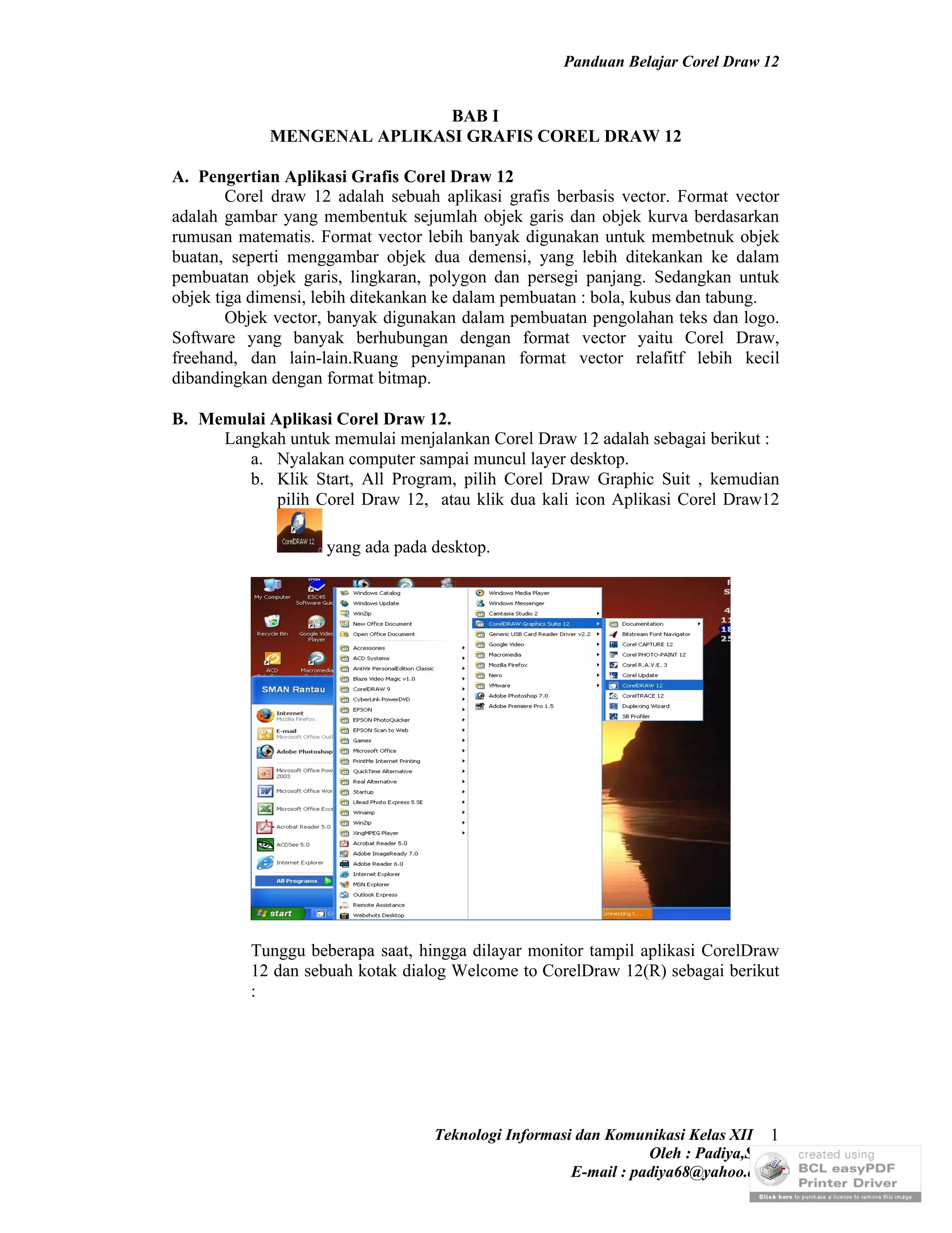Panduan ini membahas tentang pengenalan aplikasi grafis Corel Draw 12, meliputi pengertian Corel Draw 12, cara memulai aplikasi, mengenal layar kerja Corel Draw 12, dan mengenal berbagai tools yang tersedia. Panduan ini juga menjelaskan cara menggambar berbagai objek dasar seperti garis, persegi panjang, lingkaran, dan teks menggunakan berbagai tools Corel Draw 12.