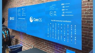 CoreOS is a container-optimized operating system designed to enhance container infrastructure management. It emphasizes automatic updates, minimal kernel use, and secure operations for applications deployed in clustered environments using components like Kubernetes and Docker. The document provides an overview of its architecture, container management, and operational practices, along with examples of commands and configurations for managing containers.