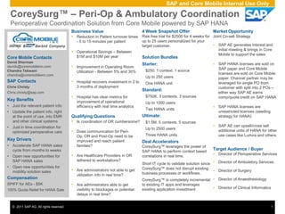 This document describes a joint sales and marketing strategy between SAP and Core Mobile to sell CoreySurg, a perioperative coordination solution powered by SAP HANA. Key points of the strategy include: