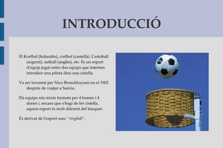 INTRODUCCIÓ El Korfbal(holandés), corfbol (castellà). Cestoball (argentí), netball (anglès), etc. És un esport d'equip jugat entre dos equips que intenten introduir una pilota dins una cistella.