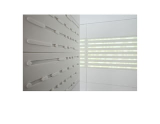 This document discusses Corian®, a composite material made of minerals and acrylic polymer. It provides details on its composition and advantages. It then presents two case studies where Corian® was used in architectural projects - a Baroque-style parking garage in Skopje, Macedonia and a medical clinic in Linz, Austria. Figures show exterior and interior views of the projects and detail drawings of how Corian® was applied in various wall and facade systems.