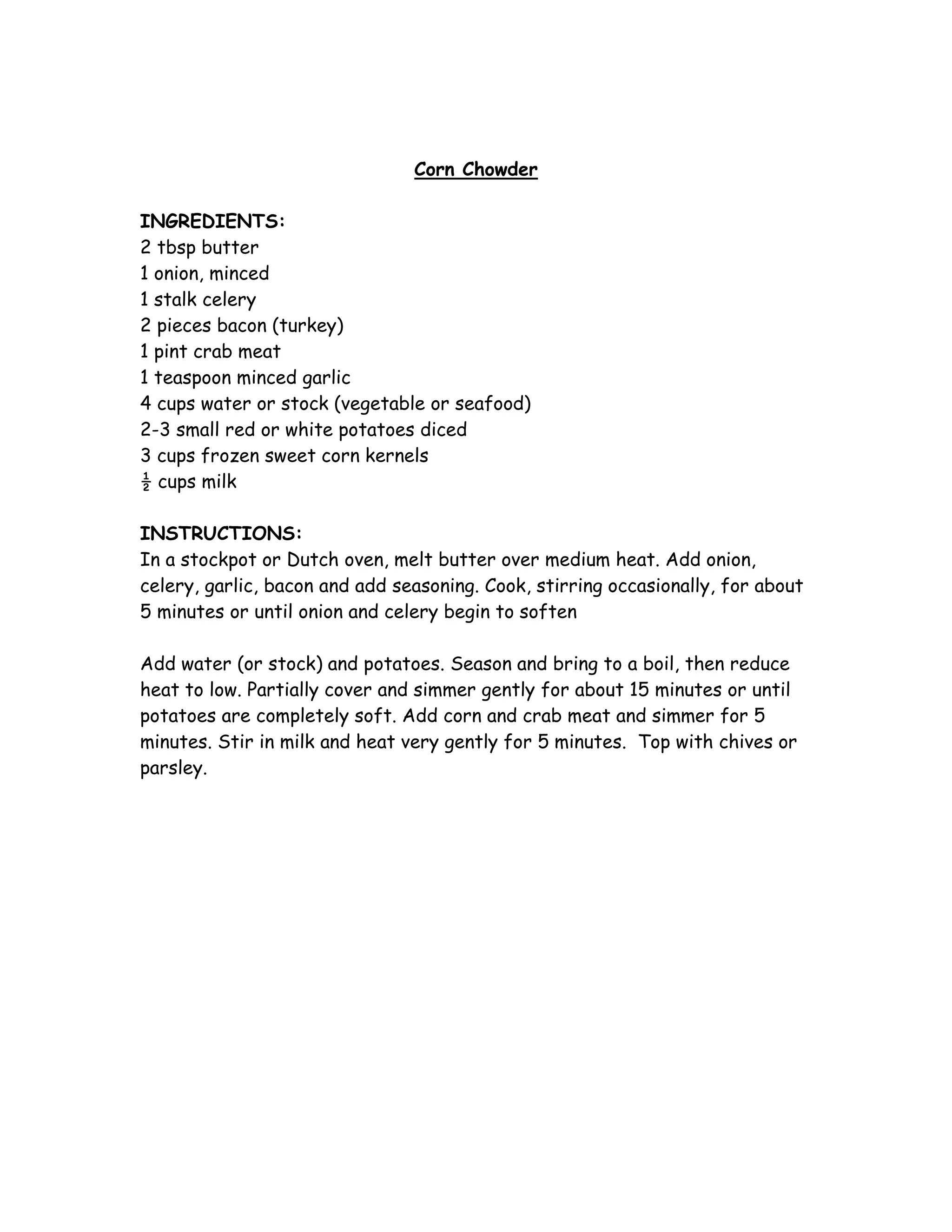 This recipe is for a corn chowder made with butter, onion, celery, bacon, crab meat, garlic, potatoes, corn kernels, milk, and stock or water. The ingredients are sautéed together before potatoes, stock, and corn are added and simmered. Finally, milk is stirred in and the chowder is heated gently before serving topped with fresh herbs.