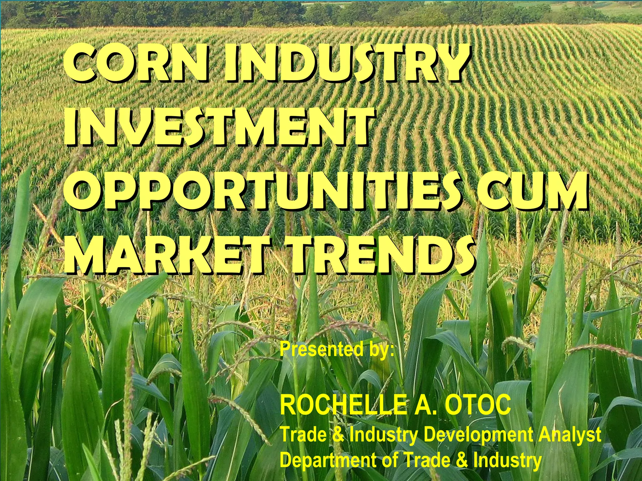 The document discusses opportunities in the Philippine corn industry. It notes that corn is the second most important crop and about 14 million Filipinos depend on it as a staple. While production has fluctuated between 2011-2016, opportunities exist in processing corn into products like starch, oil, ethanol and bioproducts. However, farmers face issues like high input costs, lack of organization and access to financing. The Department of Trade and Industry aims to help by strengthening farmer organizations, promoting investments, and providing training to improve production and develop new corn products.