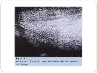 1) The cornea is the transparent front part of the eye that allows light to enter. It has five layers - epithelium, Bowman's layer, stroma, Descemet's membrane, and endothelium.