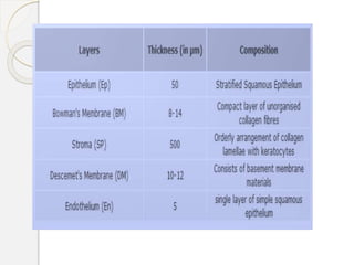The document provides information on the physiology and biochemistry of the cornea. It discusses the cornea's structure, composition, function, metabolism, wound healing, and factors that affect transparency. The cornea's layers are composed primarily of water, collagen, and proteoglycans. It maintains transparency through its regular stromal spacing and metabolic pumps that regulate hydration. The cornea relies on limbal stem cells and tight epithelial/endothelial barriers to replenish and prevent edema.
