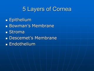 The document discusses the five layers of the cornea - epithelium, Bowman's membrane, stroma, Descemet's membrane, and endothelium. It describes the function of each layer. It also discusses corneal topography, which provides a 3D view of the cornea and is used to diagnose corneal conditions. Key measurements from topography include K readings to determine astigmatism and pachemetry readings to measure corneal thickness. Abnormal topography findings can indicate conditions like keratoconus, where the cornea protrudes in a cone shape. The document demonstrates how to properly perform corneal topography and pachymetry ultrasound scans.