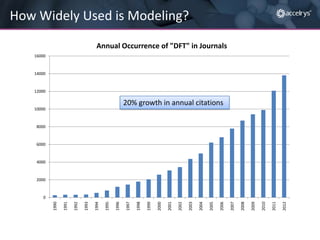 The presentation discusses the role of computational modeling in the chemicals industry, highlighting its growing importance in various sectors such as pharmaceuticals and aerospace. Successful modeling requires knowledge of relevant tools, effective communication with experimentalists, and an understanding of complex systems, like lithium-ion batteries. Examples of corporate challenges and solutions illustrate the practical applications of modeling to accelerate development and improve product performance.