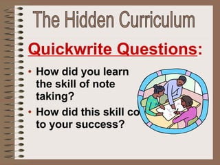 The document outlines the Cornell note-taking method, developed in 1949, which enhances critical thinking and retention by organizing notes effectively. It emphasizes the importance of creating questions that stimulate higher-level thinking and provides practical tips for effective note-taking in various learning contexts. Additionally, the document includes guidelines for summarizing notes and reviewing material to reinforce learning and improve academic success.