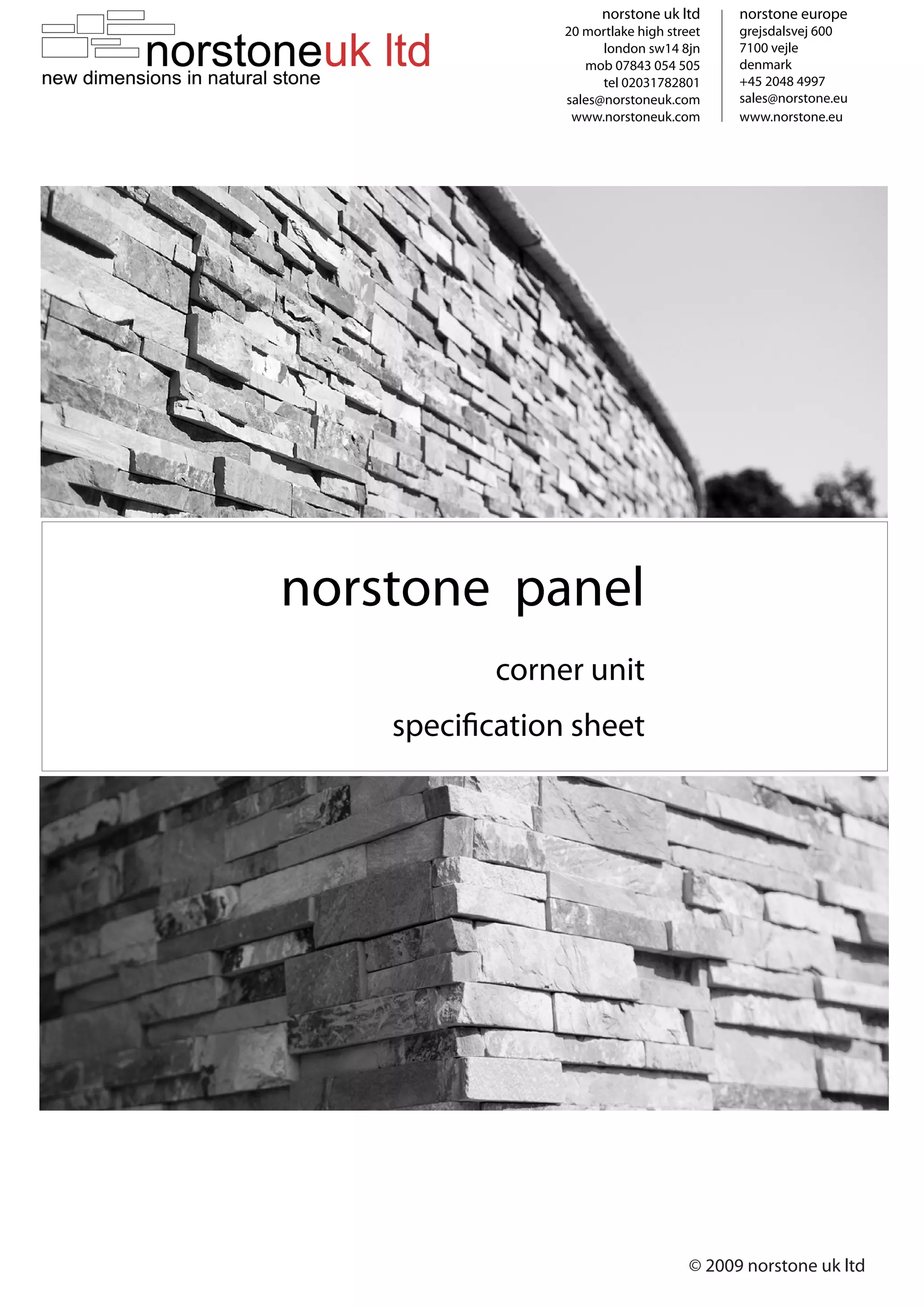 This document provides specifications for Norstone panel corner units. It outlines the stone material as quartz, marble quartz, or quartzite produced by Norstone Pty Ltd. It describes the product dimensions and packaging. Installation instructions specify using modified thinset adhesive and avoiding mortar stains. Mechanical fastening may also be used if compliant with codes. The document concludes with recommendations for stone cleaning, preservation, and protection during and after installation.