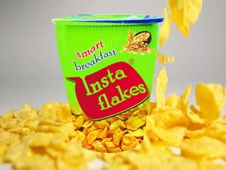 This document presents a marketing plan for a new cornflake product called InstaFlakes targeting the Indian breakfast cereal market. It provides an overview of the product, discusses the growing market opportunity in India due to rising incomes and health awareness. It analyzes competitors and identifies key consumer segments. The marketing mix, distribution strategy, and pricing are proposed. Strengths include being a nutritious instant breakfast, while threats include food regulations and substitutes. The USP is proposed as an instant multigrain variant with differential packaging.