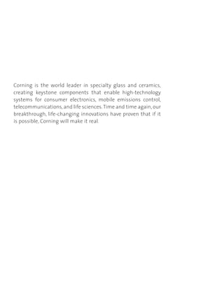 Corning posted record performance in the first half of 2008 but experienced weak performance in the second half due to the global recession. While sales were up 21% in the first half, they declined 30% in the fourth quarter compared to the third quarter and previous year. Corning implemented cost-cutting measures like job cuts and spending reductions to prepare for a weak 2009. However, Corning remains confident in its long-term strategies and innovative products to drive future growth once the economy recovers.