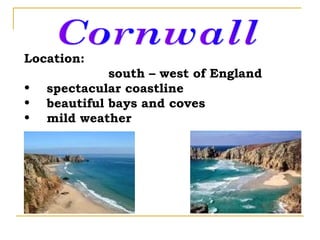 Southwest England is known for its spectacular coastline with wide, clean beaches popular for water sports like windsurfing and surfing. The village offers restaurants with coastal views and is famous as the last place on mainland Britain. Visitors can also see where Guglielmo Marconi first sent a wireless signal across the Atlantic to Canada in 1901, marked by a monument where the inventor worked.