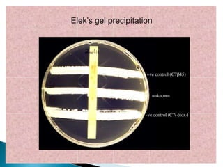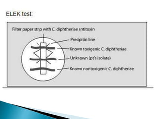 This document summarizes the characteristics and pathogenicity of Corynebacterium diphtheriae, which causes diphtheria. It notes that C. diphtheriae appears as slender, gram-positive rods that can have club-shaped ends and contain metachromatic granules. Infection typically occurs in the upper respiratory tract, where the bacteria's toxin causes a pseudomembrane and systemic effects. Transmission is through droplets or direct contact. Immunization with diphtheria toxoid vaccine provides protection against the disease.