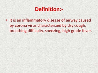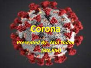 This document discusses corona (COVID-19), including its definition, causes, risk factors, symptoms, transmission, complications, medical management, nursing management, nursing diagnoses, and prevention methods. Corona is an inflammatory airway disease caused by the corona virus, characterized by dry cough, breathing difficulty, and fever. It can range from mild to severe and even cause death. Prevention focuses on hand washing, covering coughs, quarantine of travelers, and social distancing. Treatment involves supportive care like oxygen and antiviral medications.