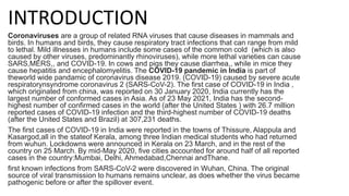 Coronaviruses can cause respiratory illnesses ranging from mild to lethal in humans and other animals. COVID-19 is caused by the SARS-CoV-2 virus and was first detected in Wuhan, China in late 2019. It has since caused a global pandemic. India has had over 26 million confirmed cases as of May 2021, second only to the US. COVID-19 spreads mainly through respiratory droplets and can be transmitted from pre-symptomatic or asymptomatic carriers. Symptoms range from mild to severe and include fever, cough and shortness of breath. Diagnosis involves PCR or antibody testing. Treatment focuses on symptom relief, and those with mild or no symptoms can recover with home isolation if proper precautions are followed.