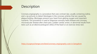 Coronary angiography is a procedure that uses contrast dye and x-rays to detect any blockages in the coronary arteries. Blockages can prevent the heart from receiving enough oxygen. The procedure is used to diagnose heart conditions and is recommended if someone experiences chest pain or other symptoms. A coronary angiogram costs between Rs. 6,500 to Rs. 50,000 when performed in Bangalore, India.