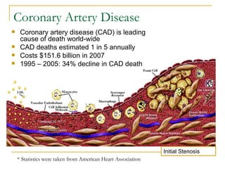 Stent design aspects and coronary artery disease were discussed. Coronary artery disease is a leading cause of death worldwide. Historical developments in treatments including balloon angioplasty, bare metal stents, and drug-eluting stents were covered. Mechanisms of in-stent restenosis and approaches to prevent it such as mechanical techniques, drug coatings, and biodegradable stents were described. Clinical measures for evaluating restenosis outcomes were defined.