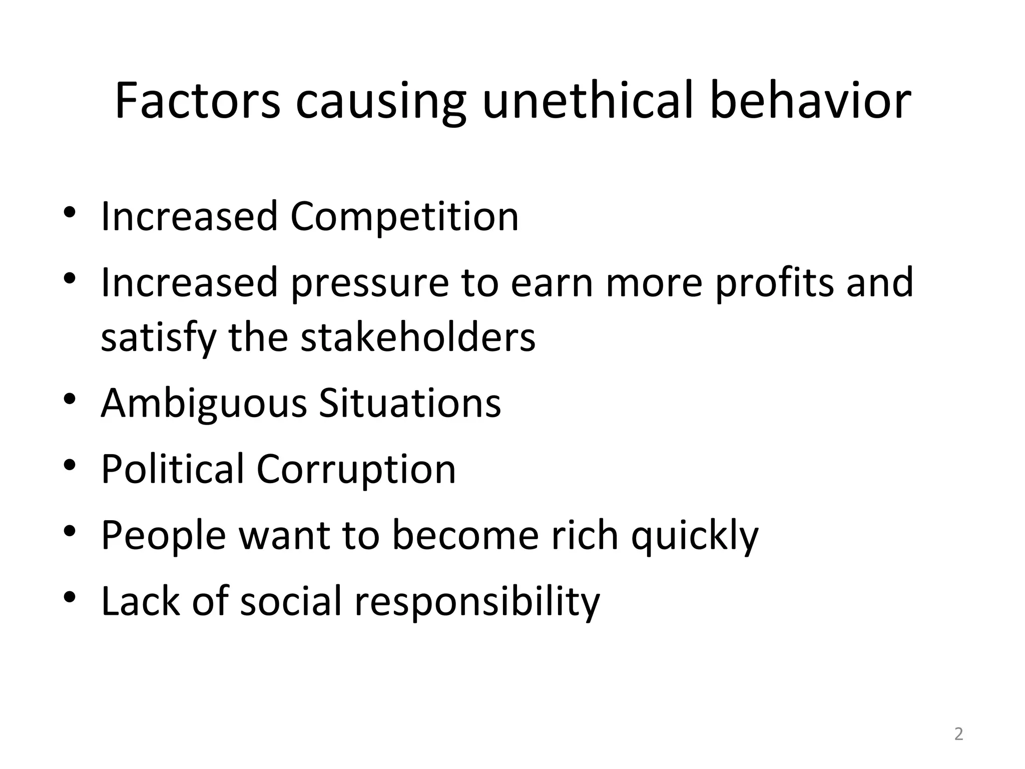 The document discusses factors that can lead to unethical corporate behavior such as increased competition and pressure to earn profits, as well as ambiguous situations and corruption. It also discusses how companies can build an ethical infrastructure through commitment from top management, codes of ethics, ethics training, audits, and appointing an ethics officer. The document outlines steps for ethical decision making and principles of ethical reasoning. It notes challenges like globalization and conflicts between individual and organizational values. Finally, it provides guidelines for managers including developing a personal code of ethics and ensuring quality, safety, fair dealing, and compliance.