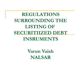 This document summarizes regulations surrounding the listing of securitized debt instruments in India. It discusses how 2007 amendments to the Securities Contracts Regulation Act allowed securitized debt instruments to be publicly traded by defining them as securities. In response, SEBI introduced regulations in 2008 governing public offerings and listings of securitized debt instruments. The regulations establish rules for special purpose entities issuing the instruments and require disclosures. SEBI also released a listing agreement for these instruments in 2011 to increase transparency and secondary market liquidity. Issues remaining include lack of effective foreclosure laws and ambiguity in the tax treatment of SPV trusts.