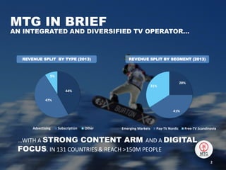 MTG is a diversified TV operator with businesses in pay-TV, free-TV, and digital media. It generates revenue from advertising (44%) and subscriptions (47%). MTG operates across the Nordic region, emerging markets, and globally via content distribution. It has a strong content business and focus on digital platforms and expansion into new geographies. MTG has a successful track record of growth and aims to continue creating long term value through its content, digital, and geographic expansion strategies.