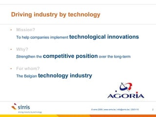 The document discusses Sirris, the collective centre of the Belgian technology industry. Sirris helps companies implement technological innovations to strengthen their competitive positions long-term. It provides services to over 4,300 Belgian companies each year, mostly small and medium-sized enterprises, across various technological sectors like automotive, electronics, and manufacturing. Sirris has over 120 experts located across 6 sites in Belgium.