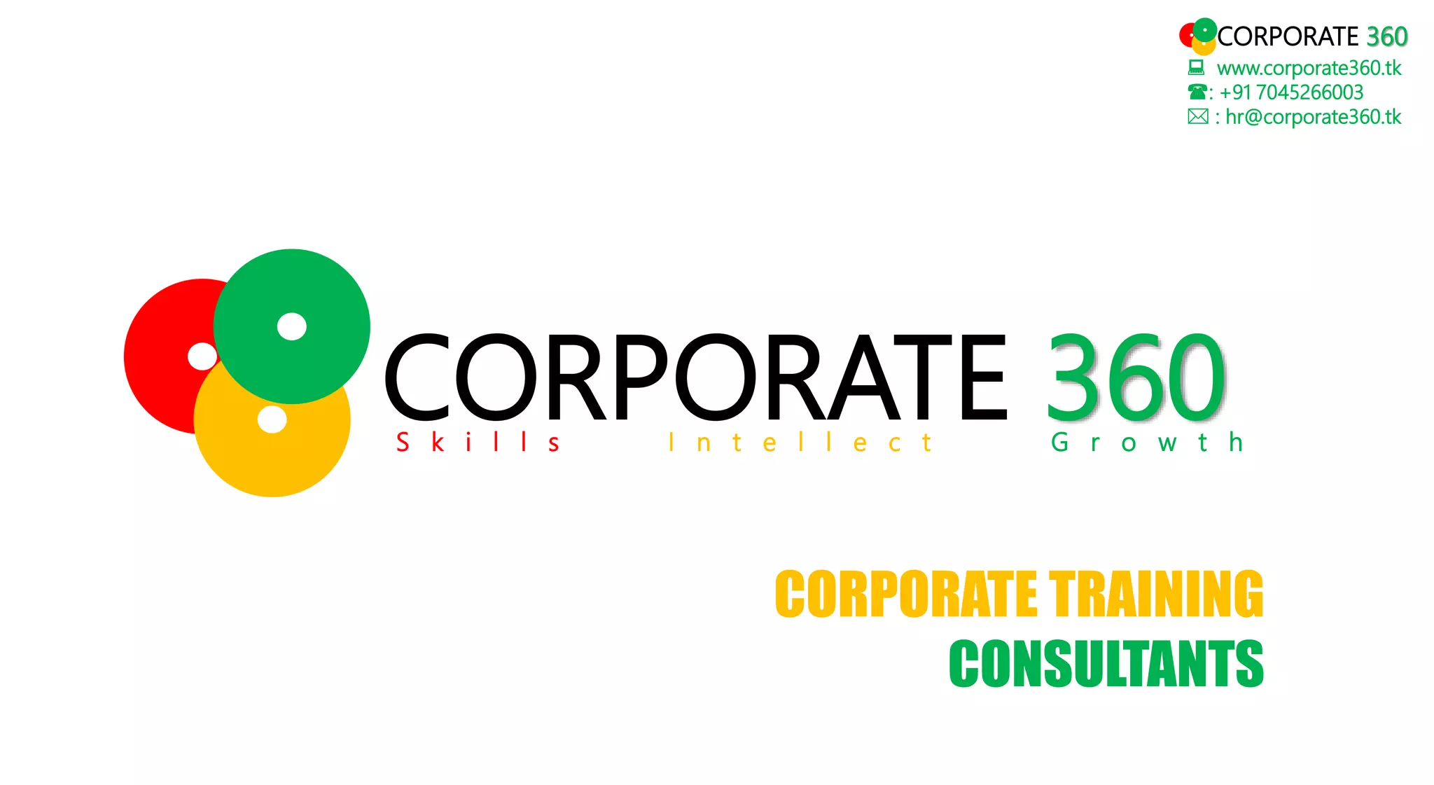 Corporate 360 Training is a training and consulting firm formed in 2012 to design training programs that suit individuals' needs and help them lead successful lives as proud Indian citizens. The company pioneered getting over 96 clients across India. Corporate 360 offers professional training on soft skills, communication, leadership, team building, and other areas. Its mission is to provide innovative training that helps employees and organizations grow, and its vision is to create a better tomorrow through individual and corporate training.