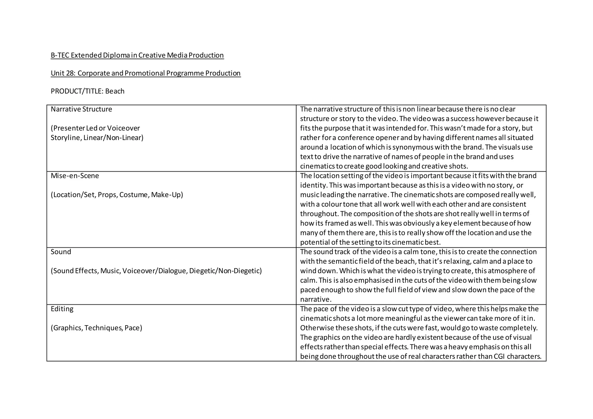 This non-linear video was created as a conference opener for a beach brand rather than telling a story. It features slow-paced cinematic shots of names situated around the beach location set to a calm soundtrack. Care was taken with lighting, framing, and camera angles to create high production value shots that capture viewers' attention without dialogue or graphics. The purpose was to appeal to a wide audience at conferences and events and reinforce the brand's identity through an atmospheric, film-like video.