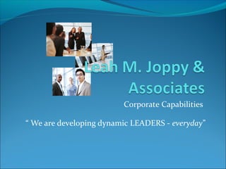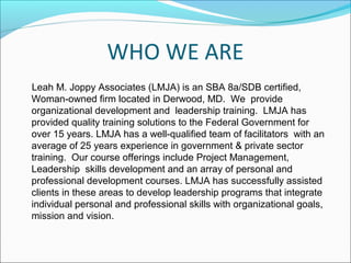 Leah M. Joppy Associates (LMJA) is a woman-owned small business that provides organizational development and leadership training to federal government clients. LMJA has over 15 years of experience in training and has a team of experienced facilitators. They offer courses in project management, leadership, and personal and professional development. Their mission is to develop exceptional leadership skills in employees at all levels through high-quality training.