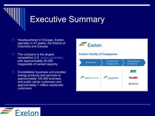 Exelon, headquartered in Chicago, is the largest competitive U.S. power generator, with a commitment to corporate social responsibility (CSR) in areas such as education and environmental sustainability. Despite its significant investments and efforts, Exelon's industry faces a weak overall reputation, reflected in various rankings and perceptions. To enhance its standing, recommendations include strengthening investor relations, improving board expertise, and actively promoting achievements through social media.