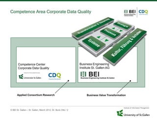 The document provides an overview of corporate data quality research and services from the Competence Center Corporate Data Quality (CC CDQ) at the University of St. Gallen. It discusses how data quality is a success factor for business and introduces the CC CDQ's research focus areas, consortium of partner companies, and services which include assessments, strategy development, and knowledge sharing. The CC CDQ team leverages expertise in research and consulting to help organizations improve data quality management.
