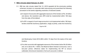 The document outlines corporate debt restructuring (CDR) in India, detailing its definition, purpose, and the timeline of its development from 2001 to 2018 when it was replaced by the insolvency and bankruptcy code (IBC). It describes the structure and implementation of CDR, including the roles of various groups involved and methods used for restructuring. Additionally, it mentions significant cases and the current scenario of corporate debt restructuring in India.