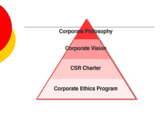 Corporate ethics refers to principles of integrity, fairness and ethical behavior in business. An ethical company considers stakeholders like employees, customers, community and the environment. While generating profits, companies must establish frameworks for acceptable behavior and high ethical standards. Everyone in a company is responsible for upholding ethics. However, some business executives prioritize short-term gains over integrity, and unethical behavior is sometimes rewarded while refusing it carries penalties. Companies need to manage ethics carefully to maximize ethical assets, prevent wrongdoing and build trust.