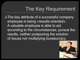 The document discusses the key attributes of successful company employees and management students according to industries. It identifies being results-oriented, possessing up-to-date knowledge, the ability to apply knowledge and achieve results, generating new solutions, and a willingness to participate as important traits. Interpersonal skills like teamwork, motivation, problem-solving, and communication are also emphasized. The document recommends career development opportunities like training courses, seminars, and internal job rotations to promote employees.