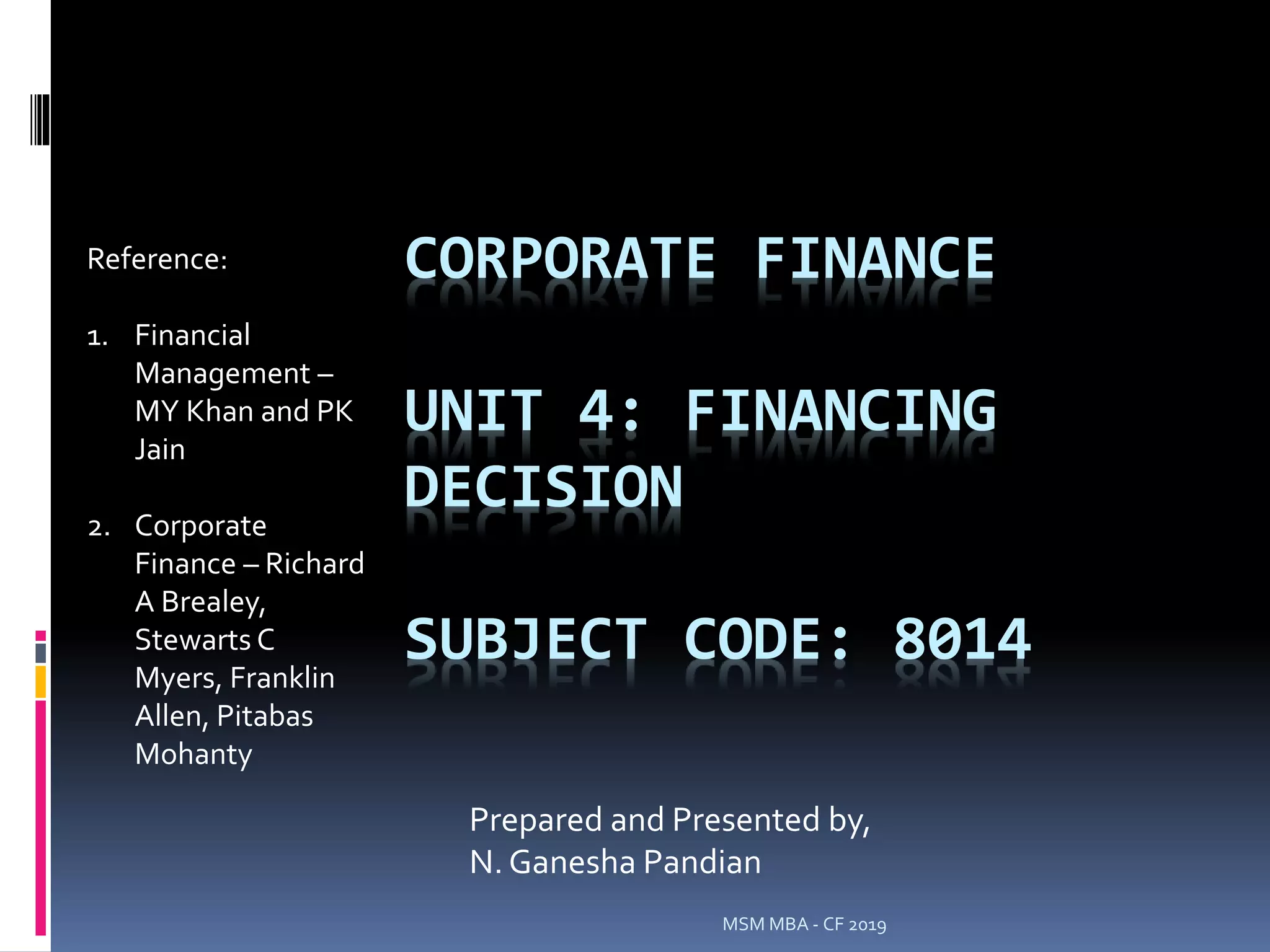 This document discusses corporate financing decisions and cash flow issues for firms. It covers topics like cash insolvency, cash inadequacy, determining debt capacity, and using simulation and option pricing models to evaluate financing choices. Key factors that influence the valuation of call options are discussed, including the current stock price, exercise price, risk-free rate, time to expiration, and price volatility. The Black-Scholes option pricing model is also introduced as a way to calculate the theoretical value of an option.
