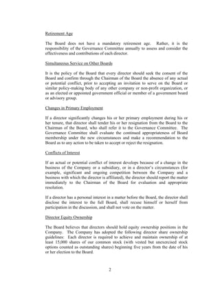 The document outlines the corporate governance guidelines of Ingram Micro Inc. regarding the composition and responsibilities of the company's board of directors. It discusses criteria for board membership, including director qualifications, term limits, ownership requirements, handling of conflicts of interest, and attendance expectations. It also describes the roles of the chairman, lead director, board committees, and processes for setting board agendas and holding executive sessions.