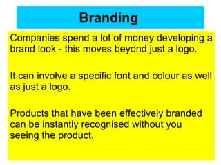 This document discusses the importance of corporate identity for businesses and products. It explains that corporate identity involves developing a name, logo, and slogan for a brand. Companies spend heavily on branding, which can involve establishing a unique font, color scheme, and visual style to make products instantly recognizable. Logos need to be simple, distinctive designs that represent the brand effectively. Choosing a product name is also critical and impacts whether a descriptive or attention-grabbing name is best. Font, color, and slogans should reinforce the brand's message and work cohesively with the logo. Developing a strong corporate identity is important for business success.