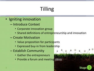 The document outlines a comprehensive innovation framework used by a corporate innovation group, detailing stages from idea generation to business launch. It emphasizes the importance of education, community engagement, and resource allocation throughout various program stages, evaluating ideas for market fit and scalability. The framework advocates for leveraging industry changes and internal resources to cultivate successful entrepreneurial initiatives.
