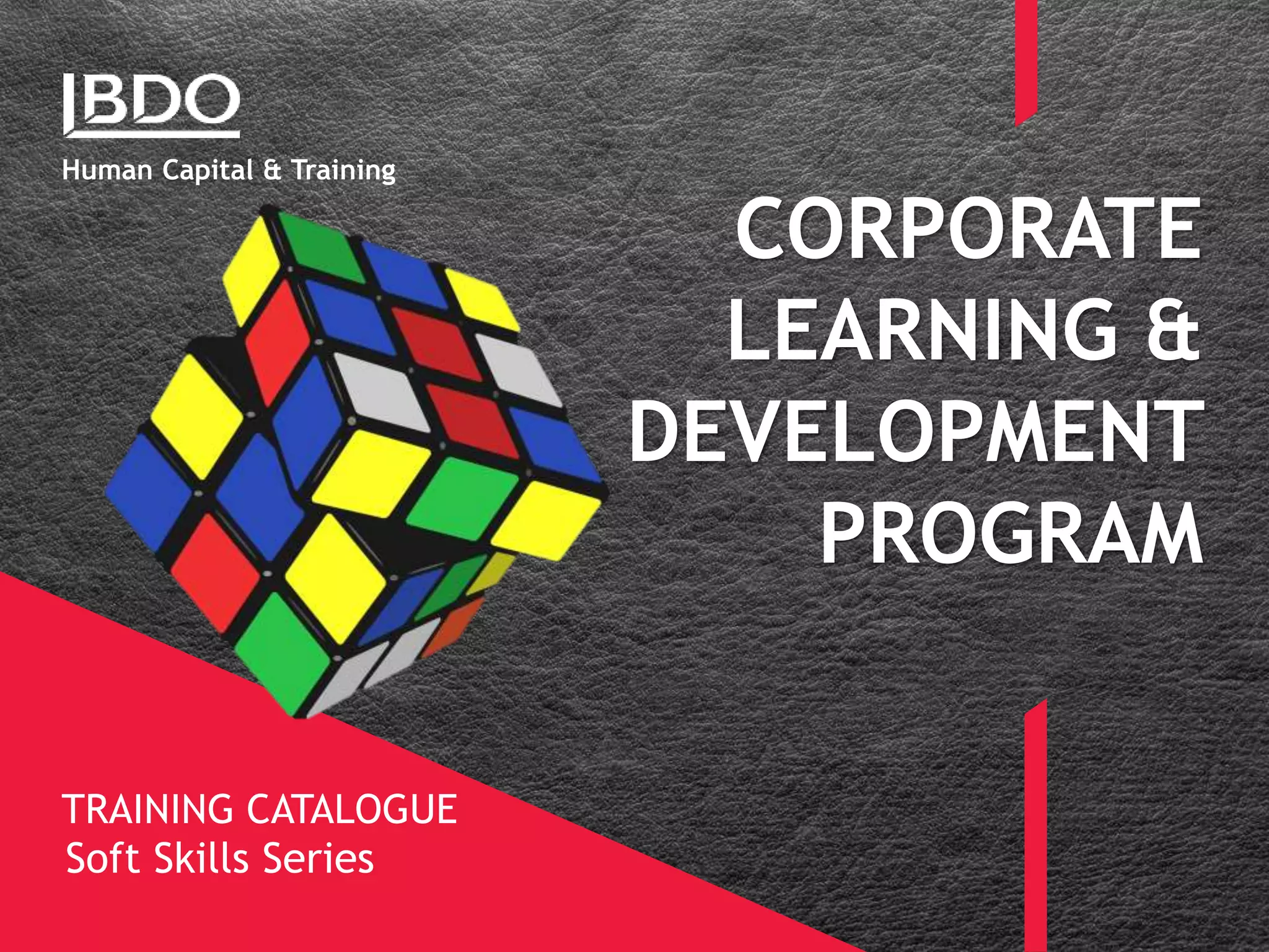 The document outlines a corporate learning and development program provided by BDO Human Capital & Training, featuring various workshops focused on soft skills such as effective communication, public speaking, team building, and negotiation skills. It emphasizes practical training and offers in-house training options with contact details for inquiries. Additionally, it presents the qualifications of facilitators leading these workshops, ensuring professional expertise in delivering the training.