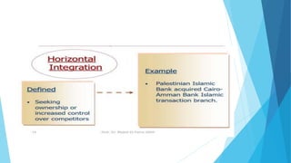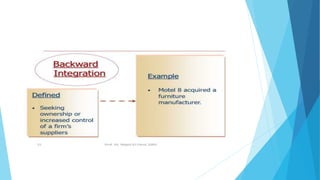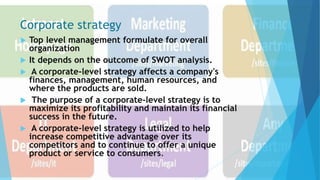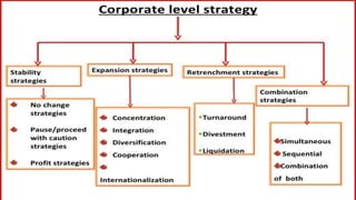 The document outlines various corporate-level strategies that organizations can employ, focusing on maximizing profitability and competitive advantage. It discusses different types of strategies, including stability, expansion, retrenchment, and combination strategies, detailing their subcategories and applications. It emphasizes the significance of conducting SWOT analyses to inform strategy formulation and make informed decisions in varying market conditions.